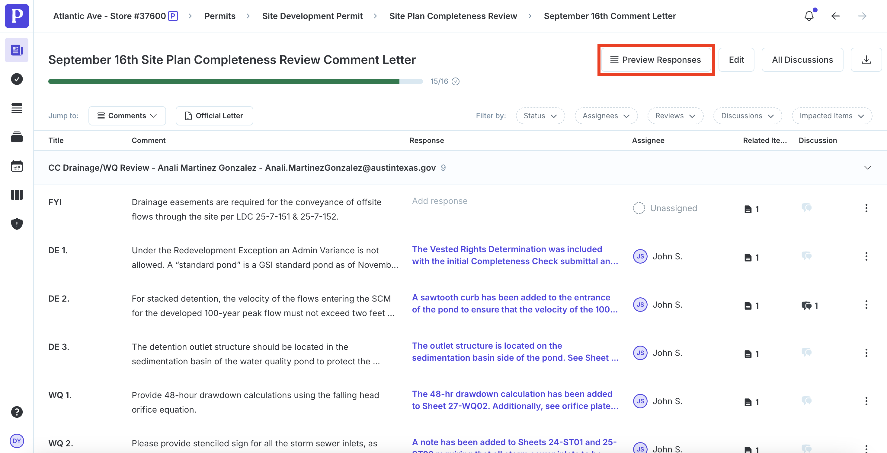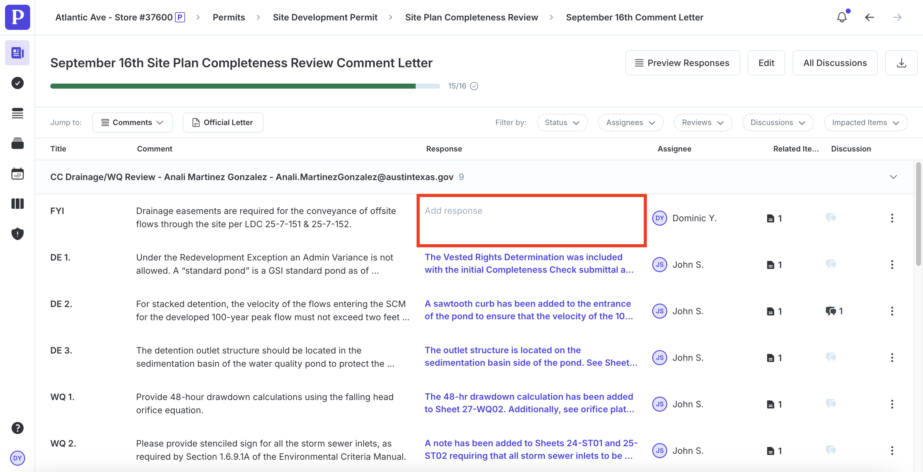 Pulley has pulled out all returned AHJ comments and from here, you can review and write your response to each comment in the Response column. These response boxes are designed to go directly to the AHJ. If you are hoping to make internal notes to Pulley or other team members, please use the Discussion feature.