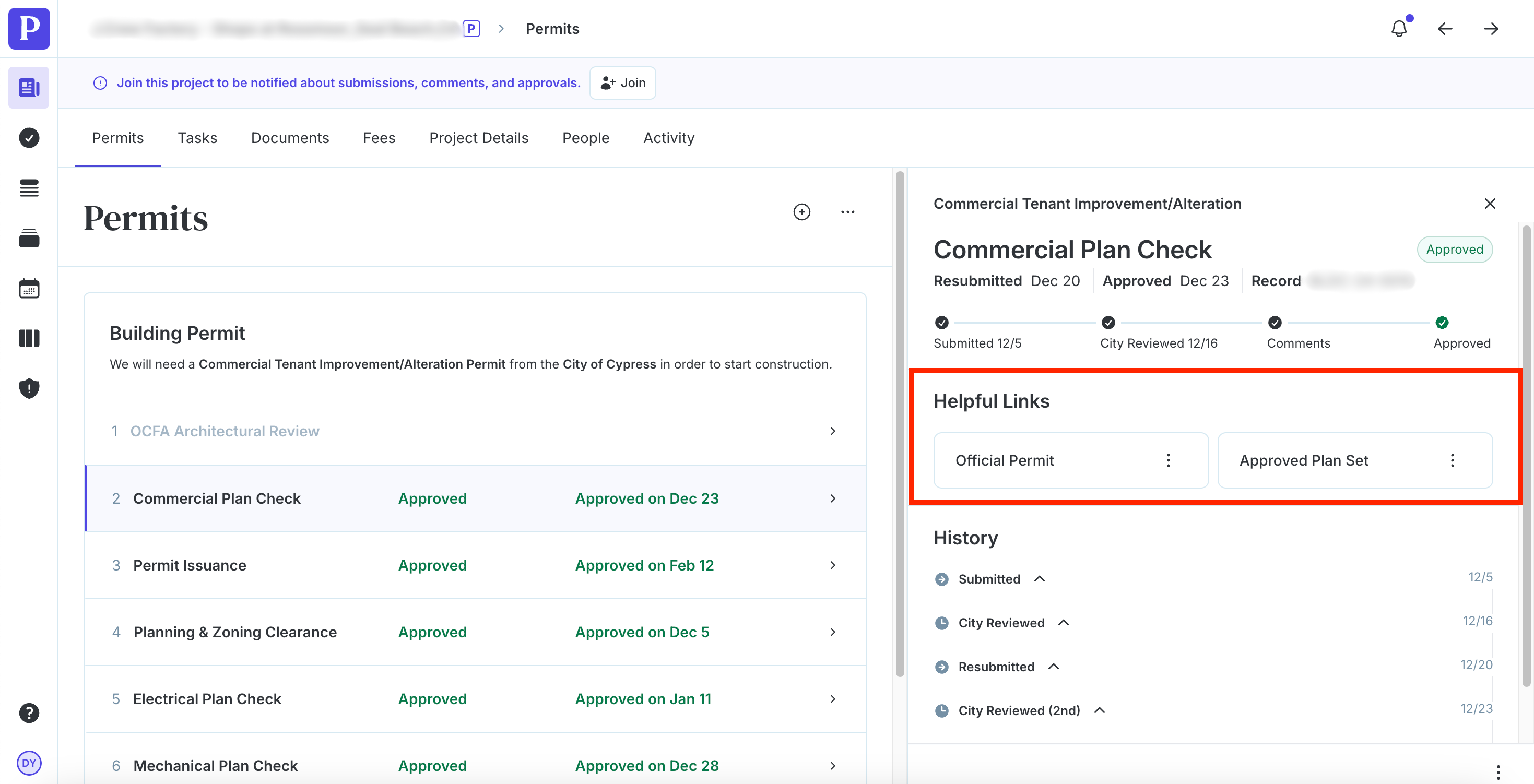 Under Helpful Links, click Official Permit to find your approved permit and Approved Plan Set to find your approved plan.