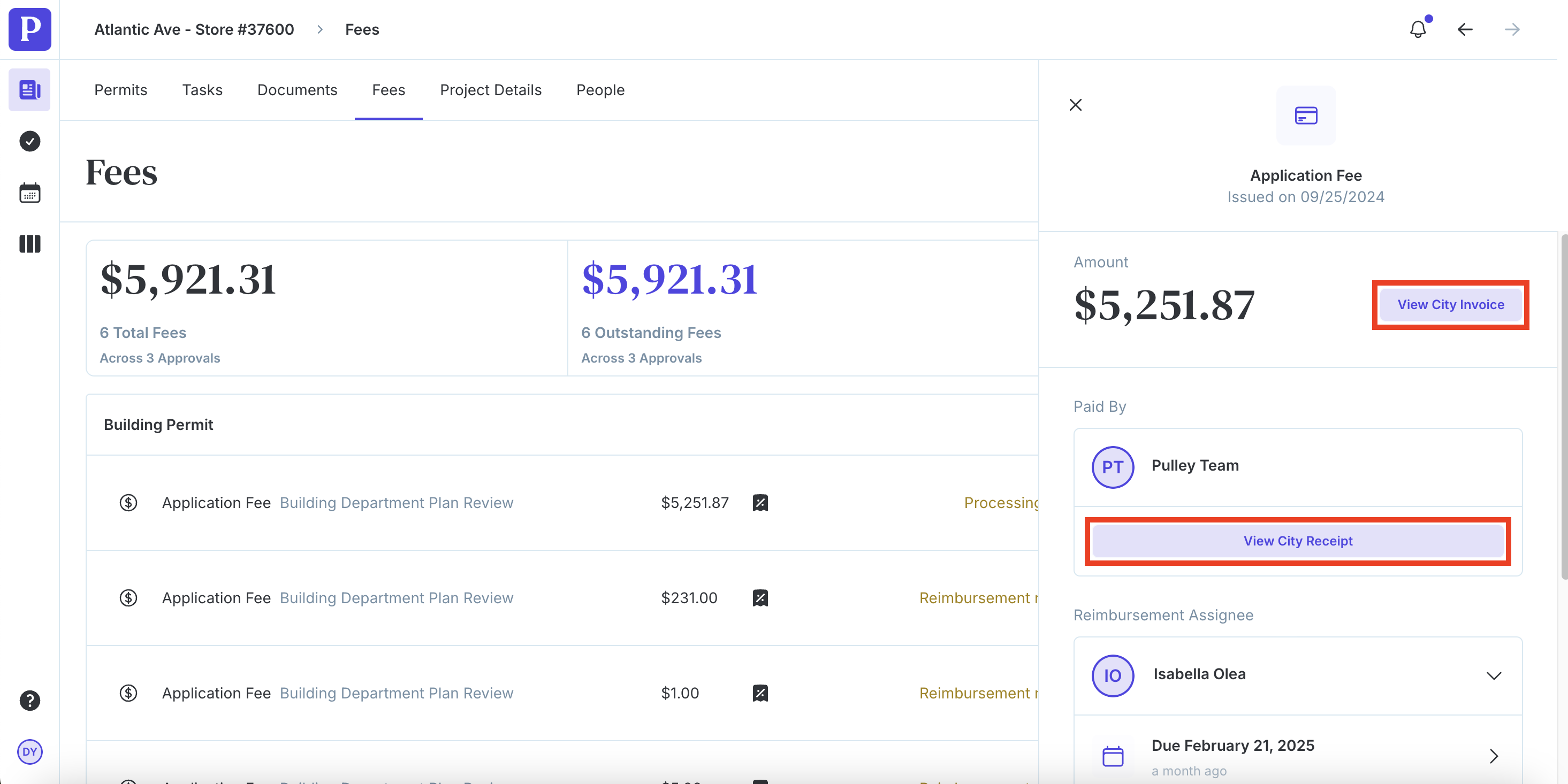 To view the official fee invoice or receipt from the city, click the fee and select View City Invoice or View City Receipt.