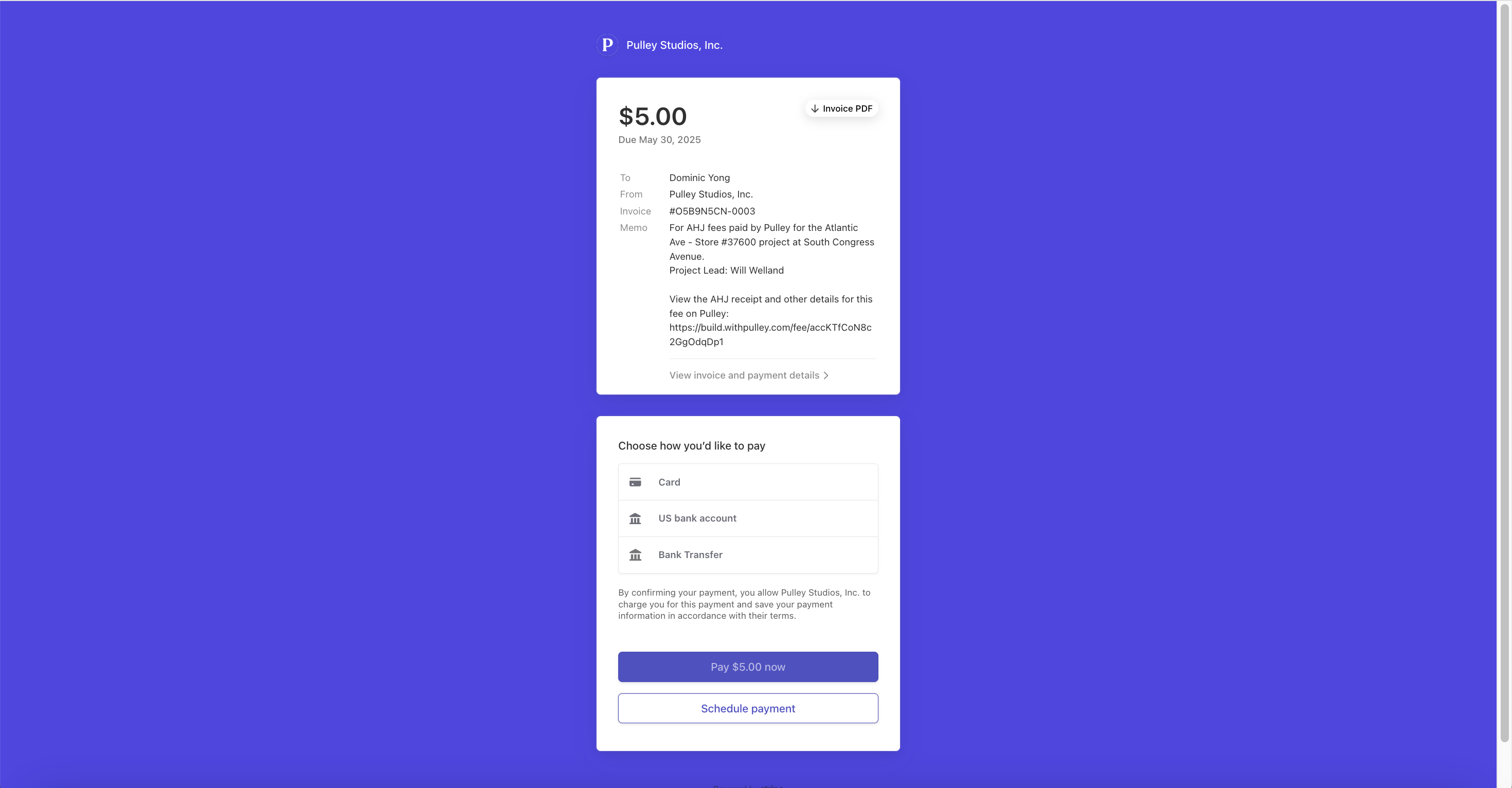 Click Pay next to the fee you want to pay which will open a Stripe page, Pulley's payment processor.