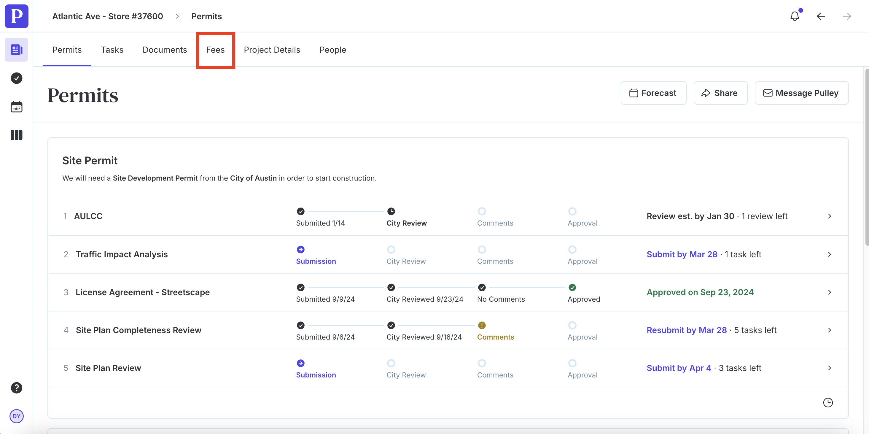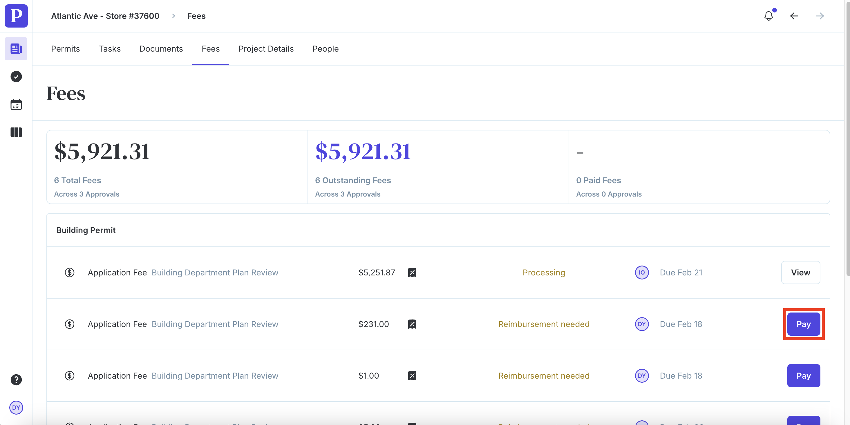 Permit fees are fees imposed by jurisdictions to obtain permits. To pay your permit fees, start by selecting the relevant project from your Portfolio overview.