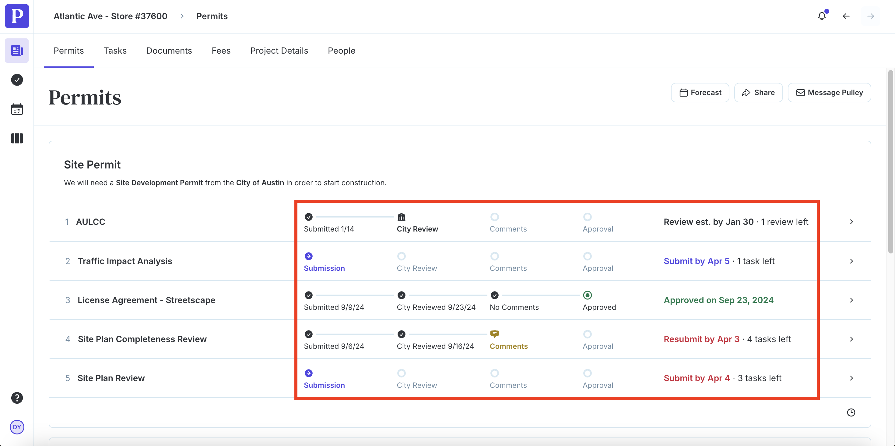 On the Permits tab of a project, you can find the status of each approval that make up your permit and the outstanding tasks required to move them towards approval. Here is what each stage means:
