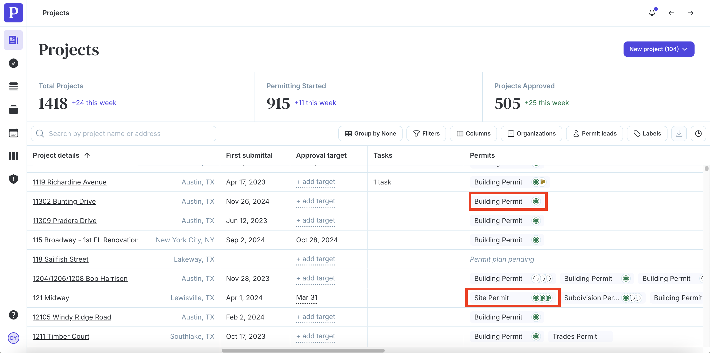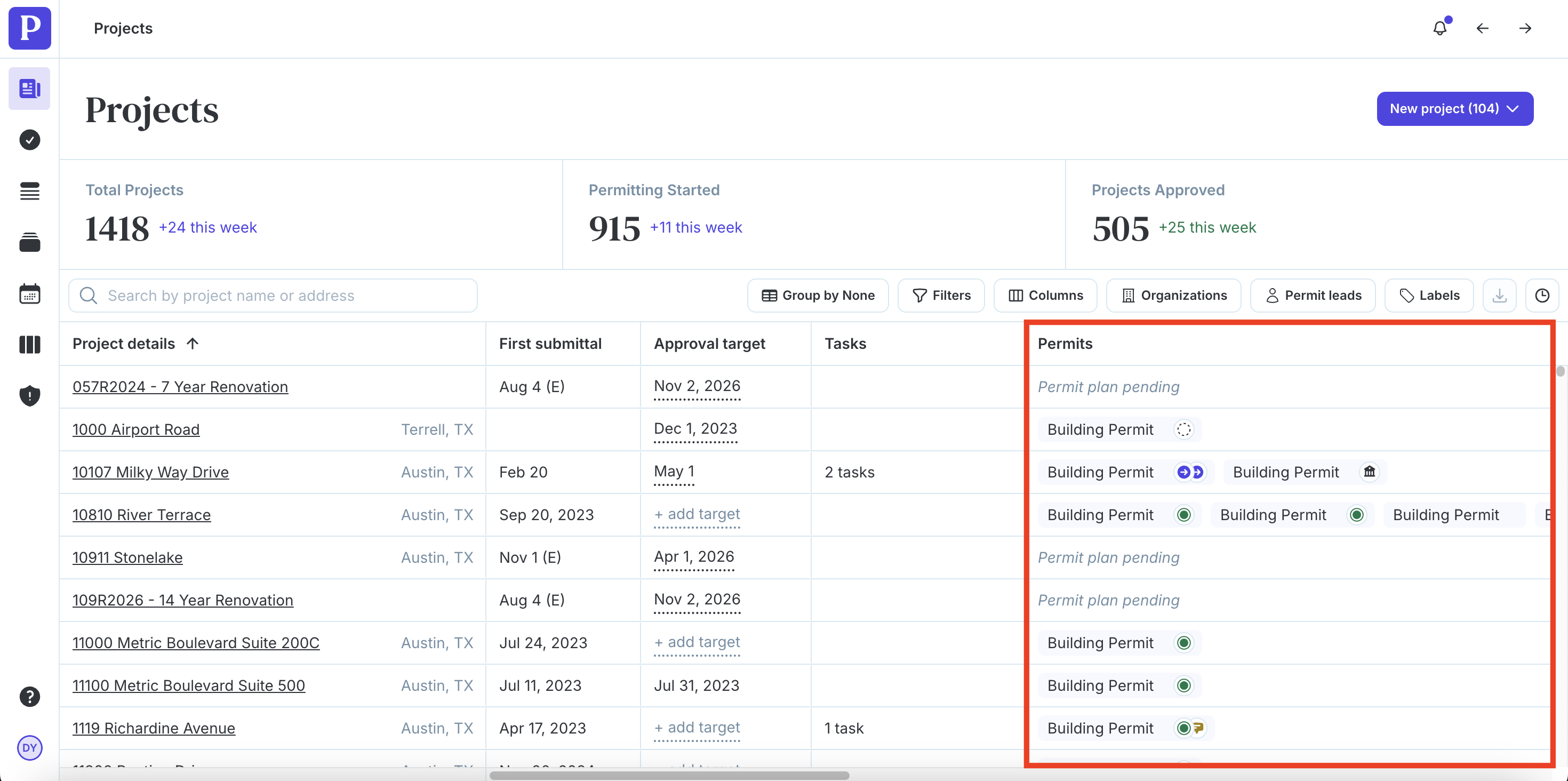 You can also view the status of your permits across multiple projects from the Projects portfolio under the "Permits" column. The circles reflect the number of approvals and their colors reflect their progress. Each color represents following approval stages: