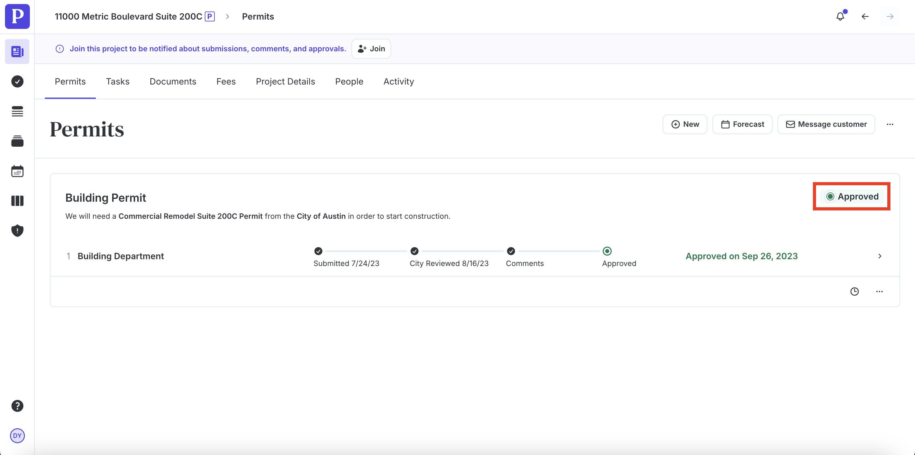 When a permit is approved, it will be marked "Approved" in the top right corner of the permit.
