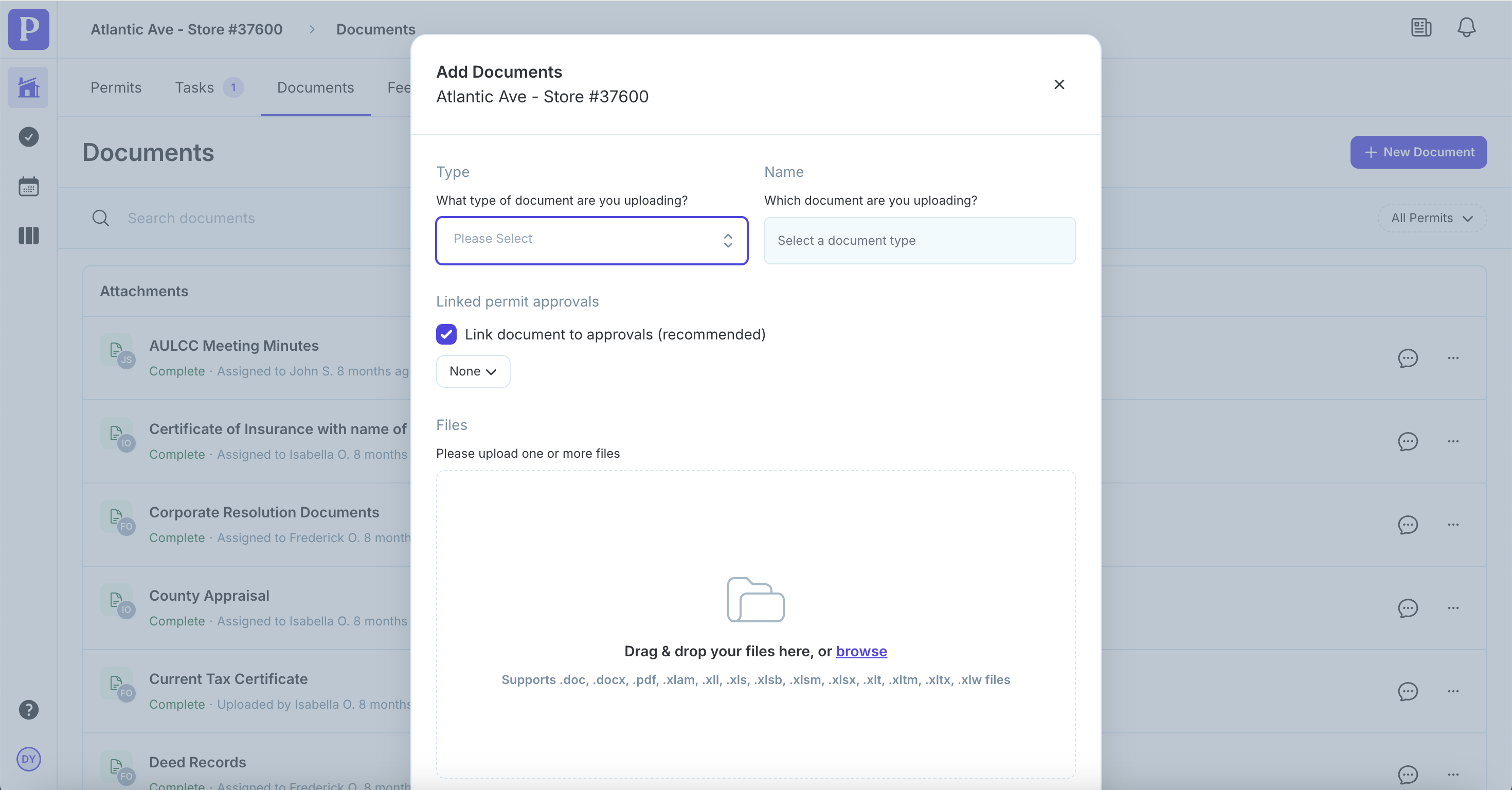 This will open a window that will allow you to select the type of document you want to upload, its name, and whether you want to link it to an approval on your permit.